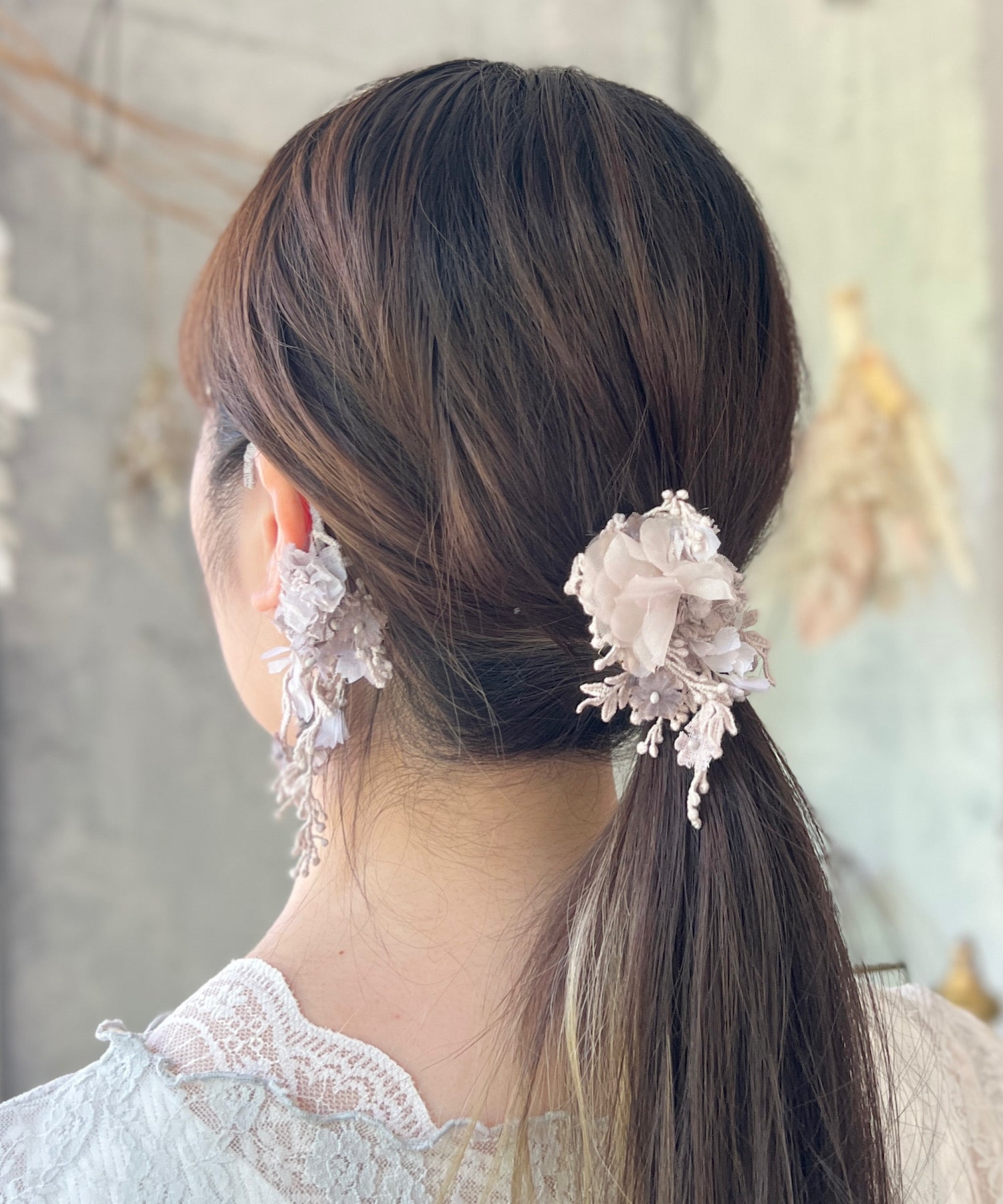 ※布花やレースは手染めをほどこしております。シミのように見える部分がある場合がございますが、染めの色となり、アンティークな風合いを出すためのものです。