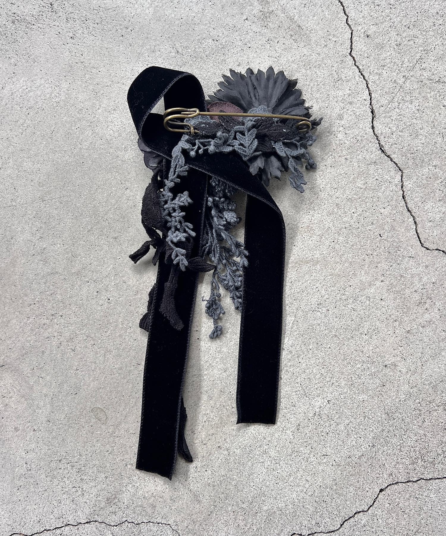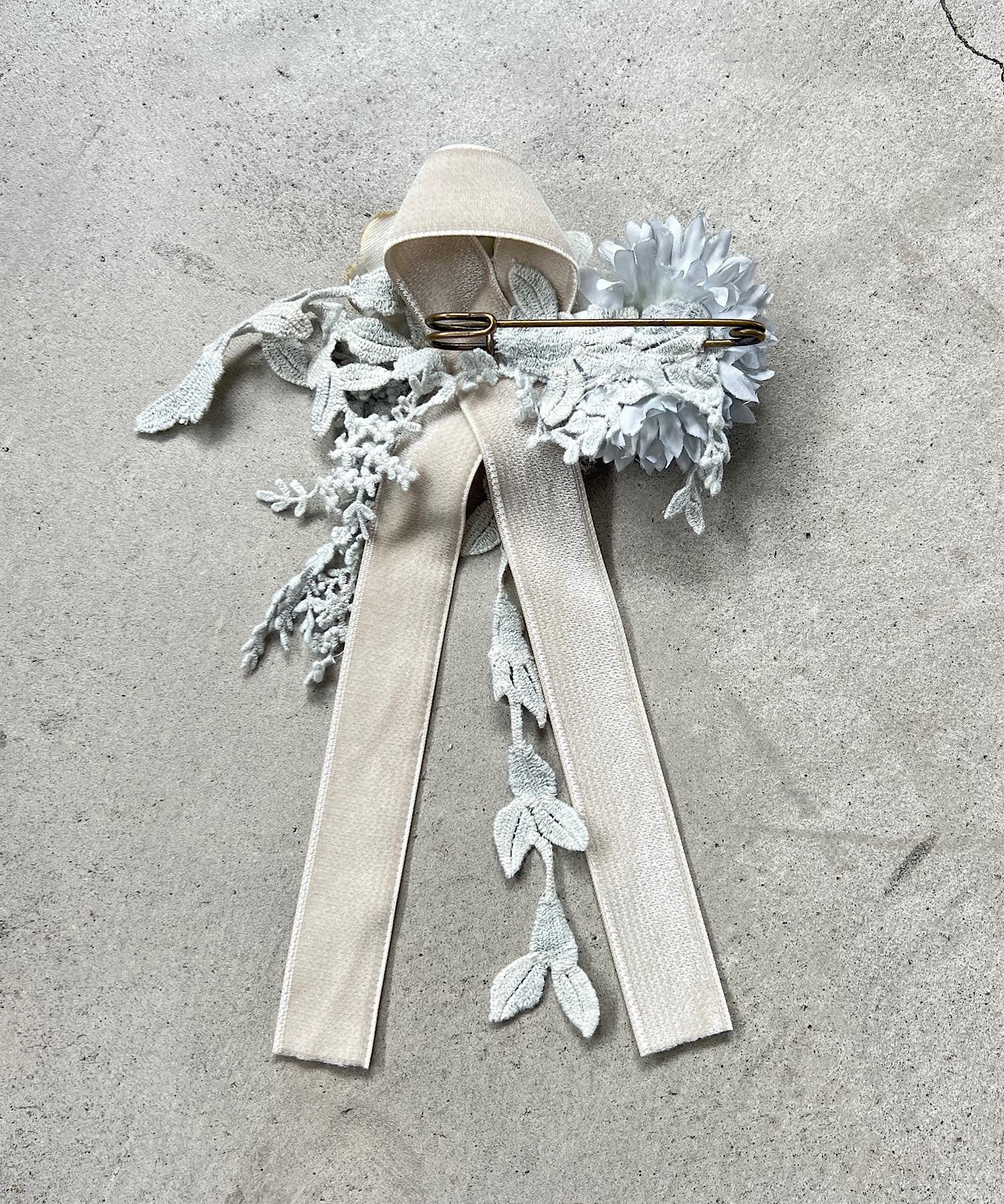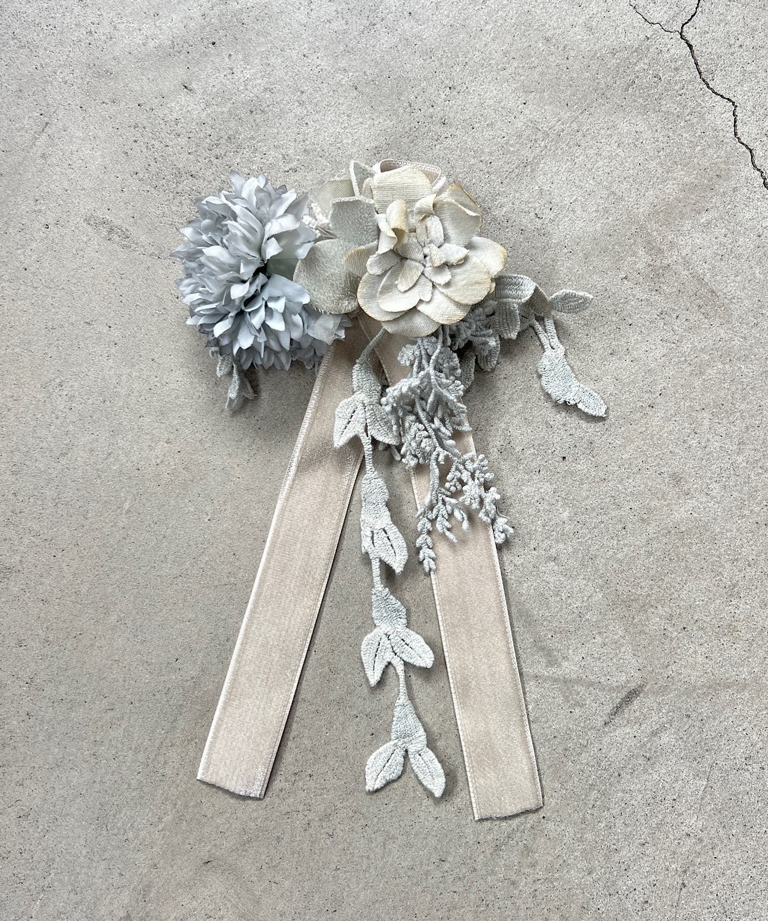 大きな布花とベロアリボンのショールピンを合わせて華やかなデザインに。