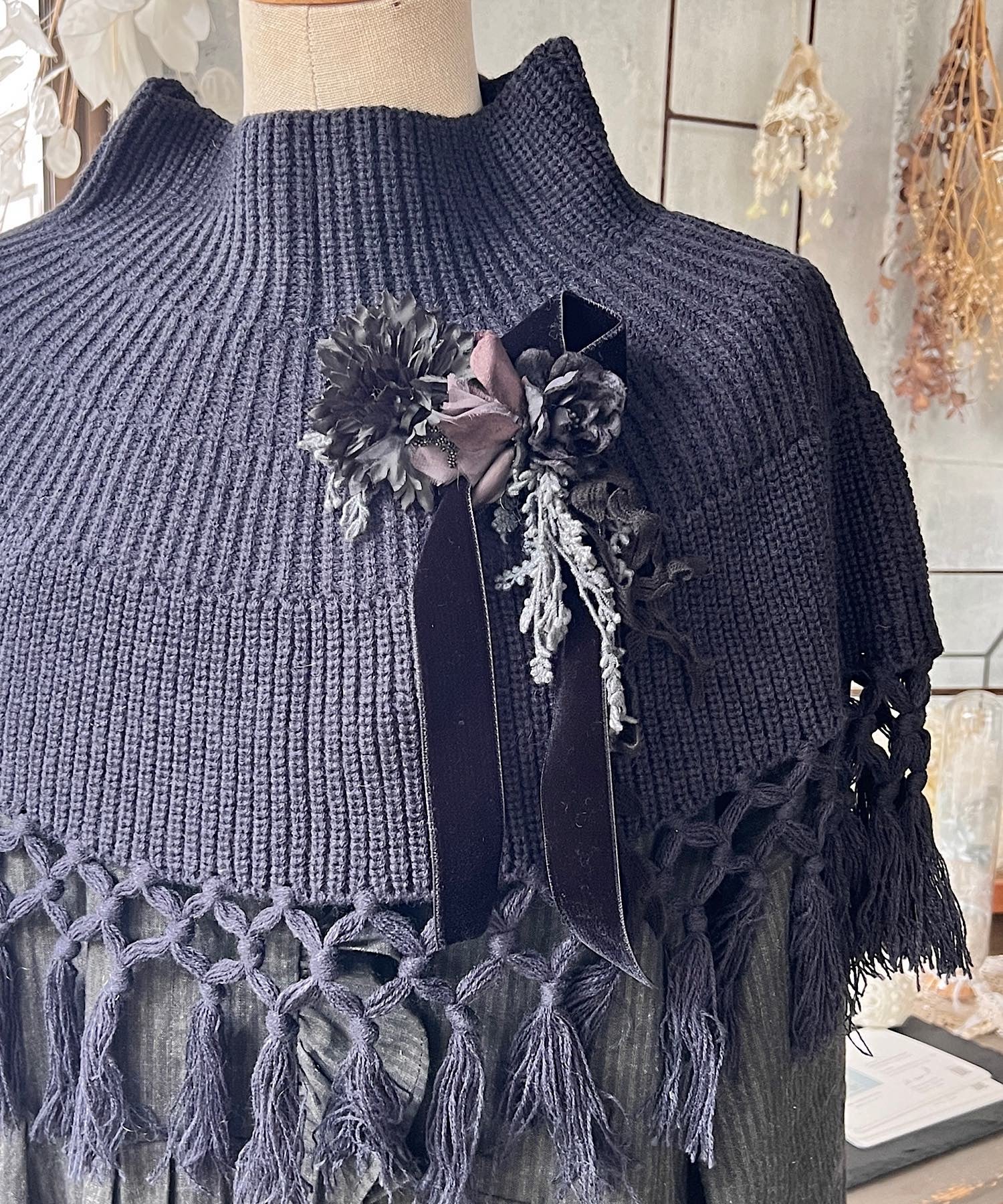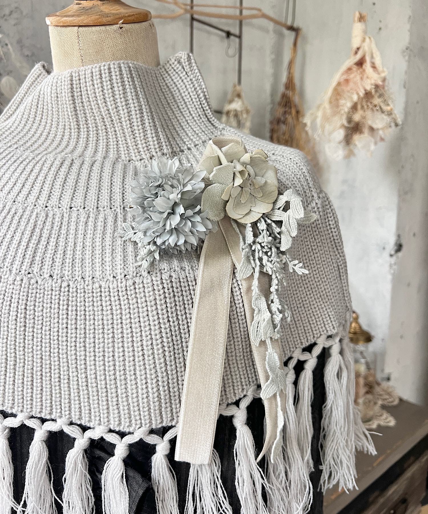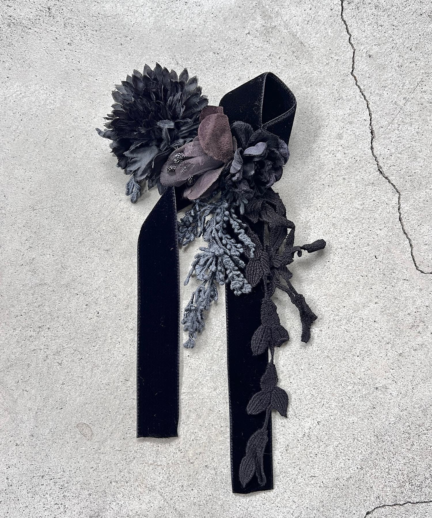 大きな布花とベロアリボンのショールピンを合わせて華やかなデザインに。