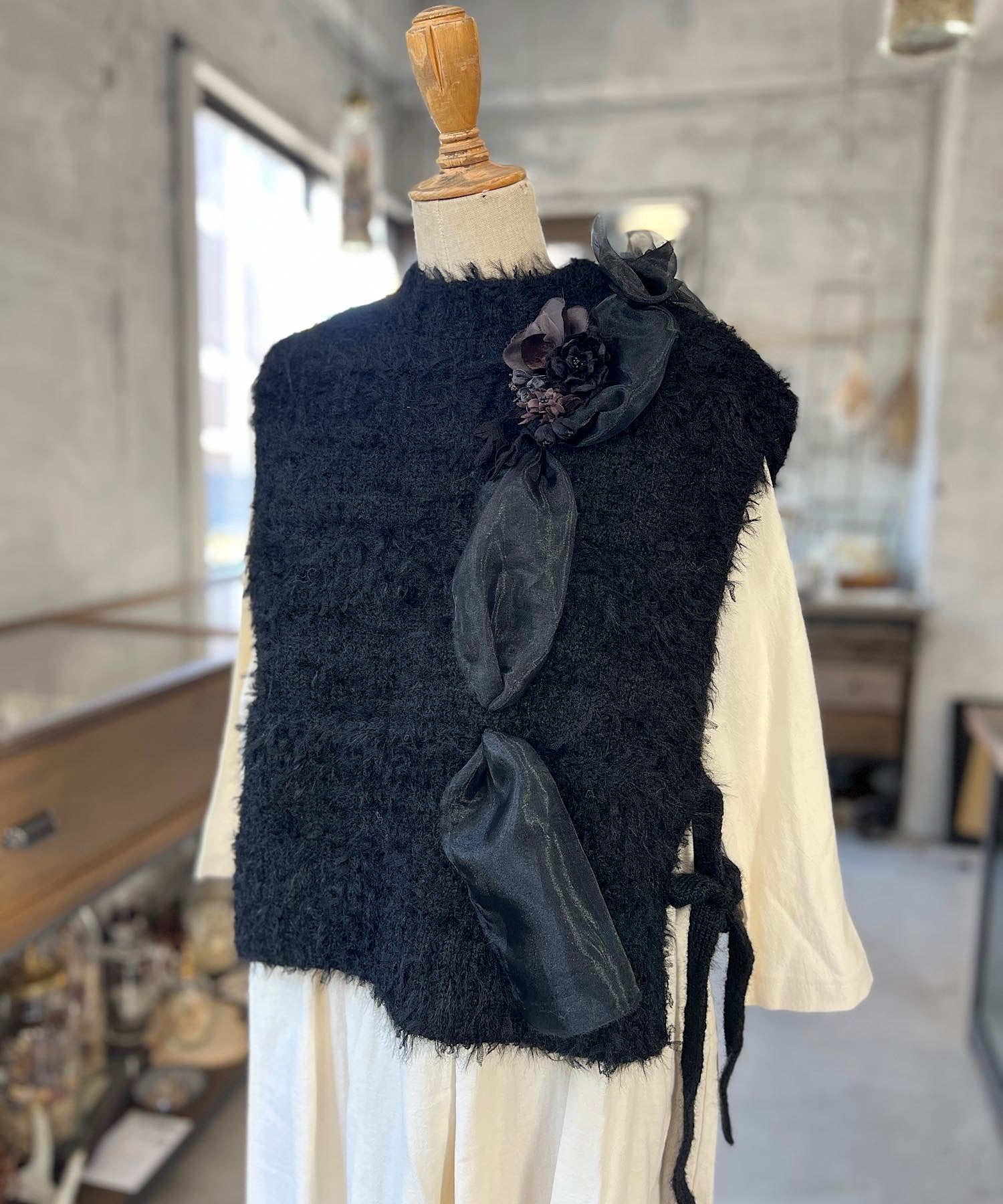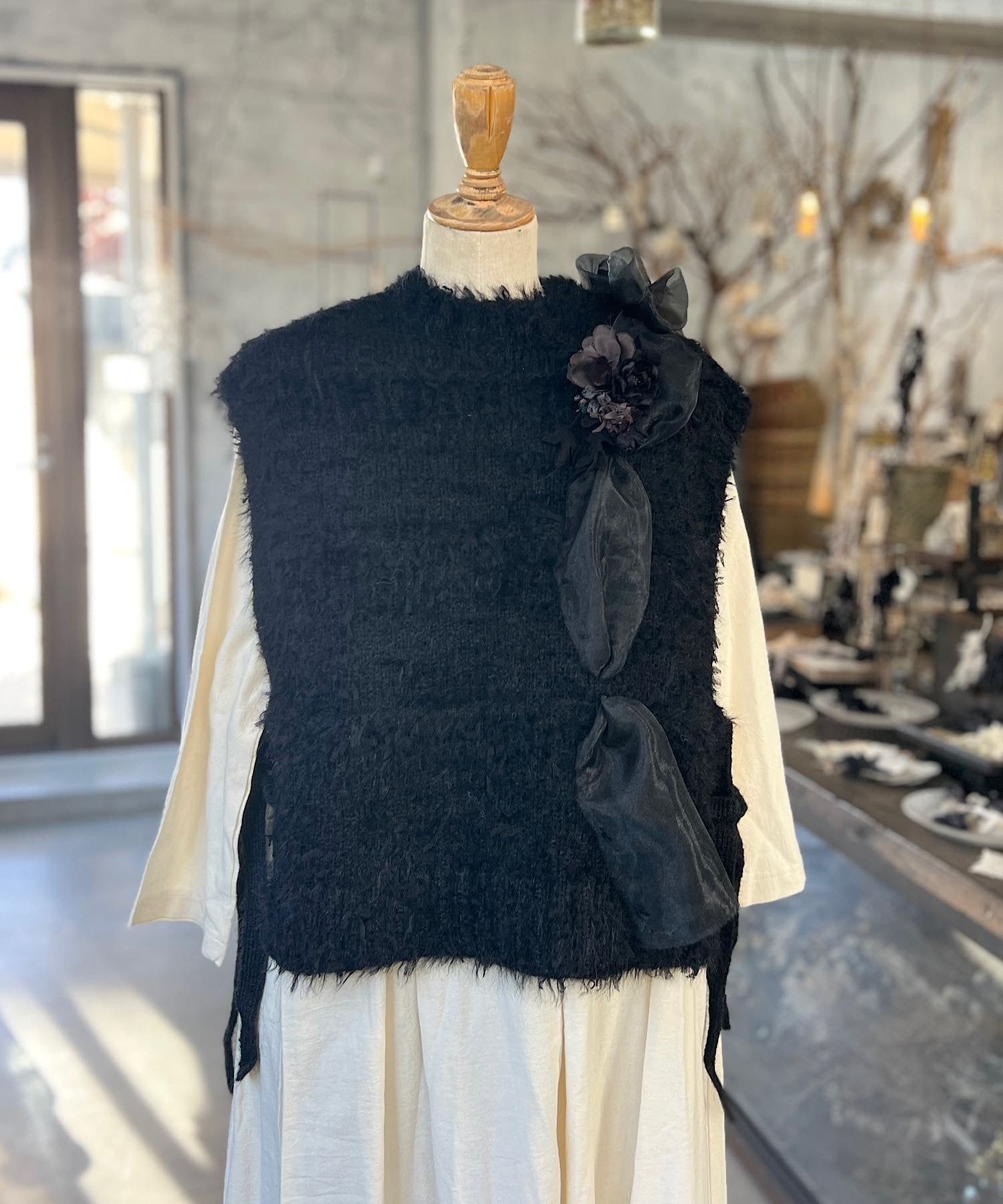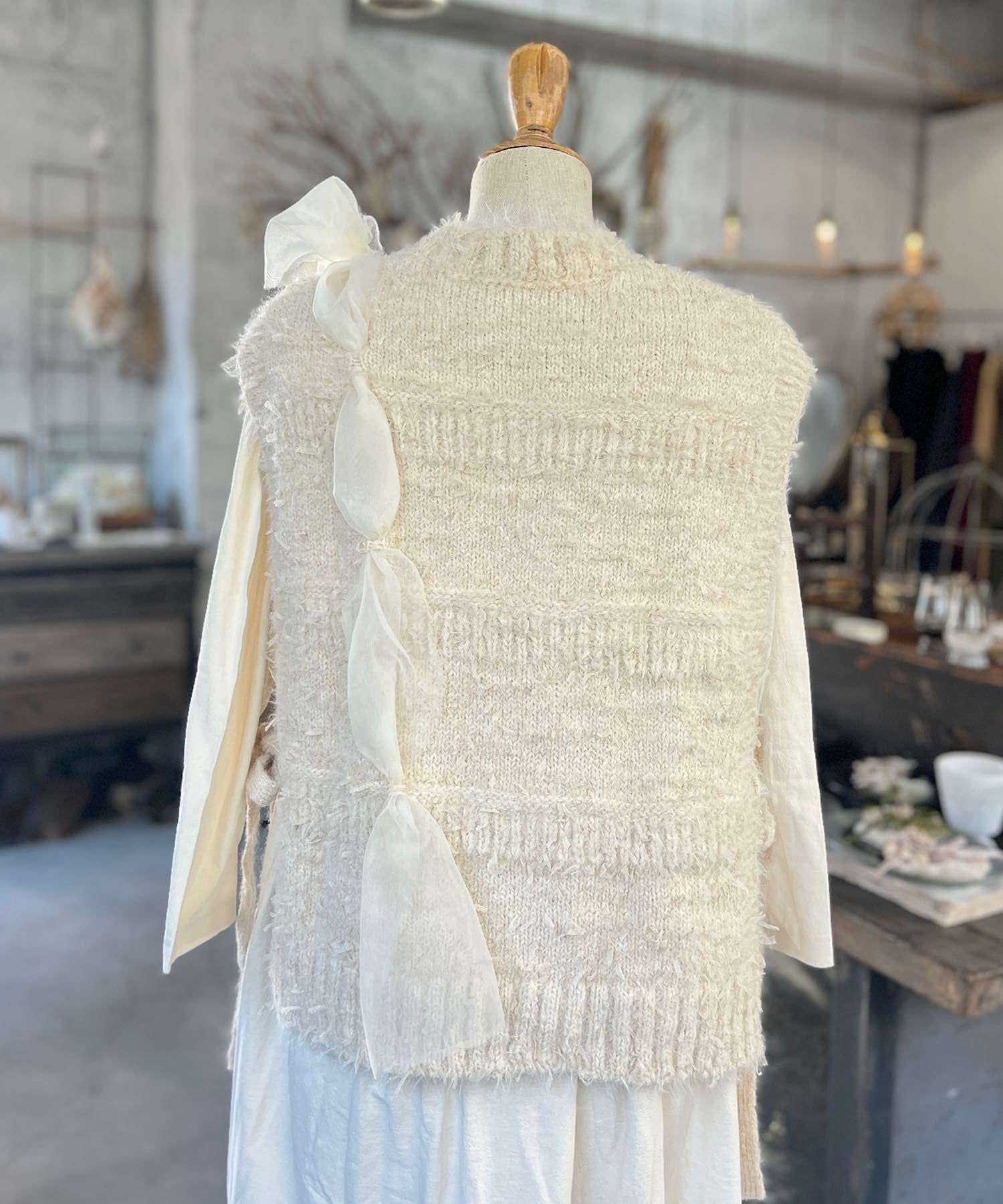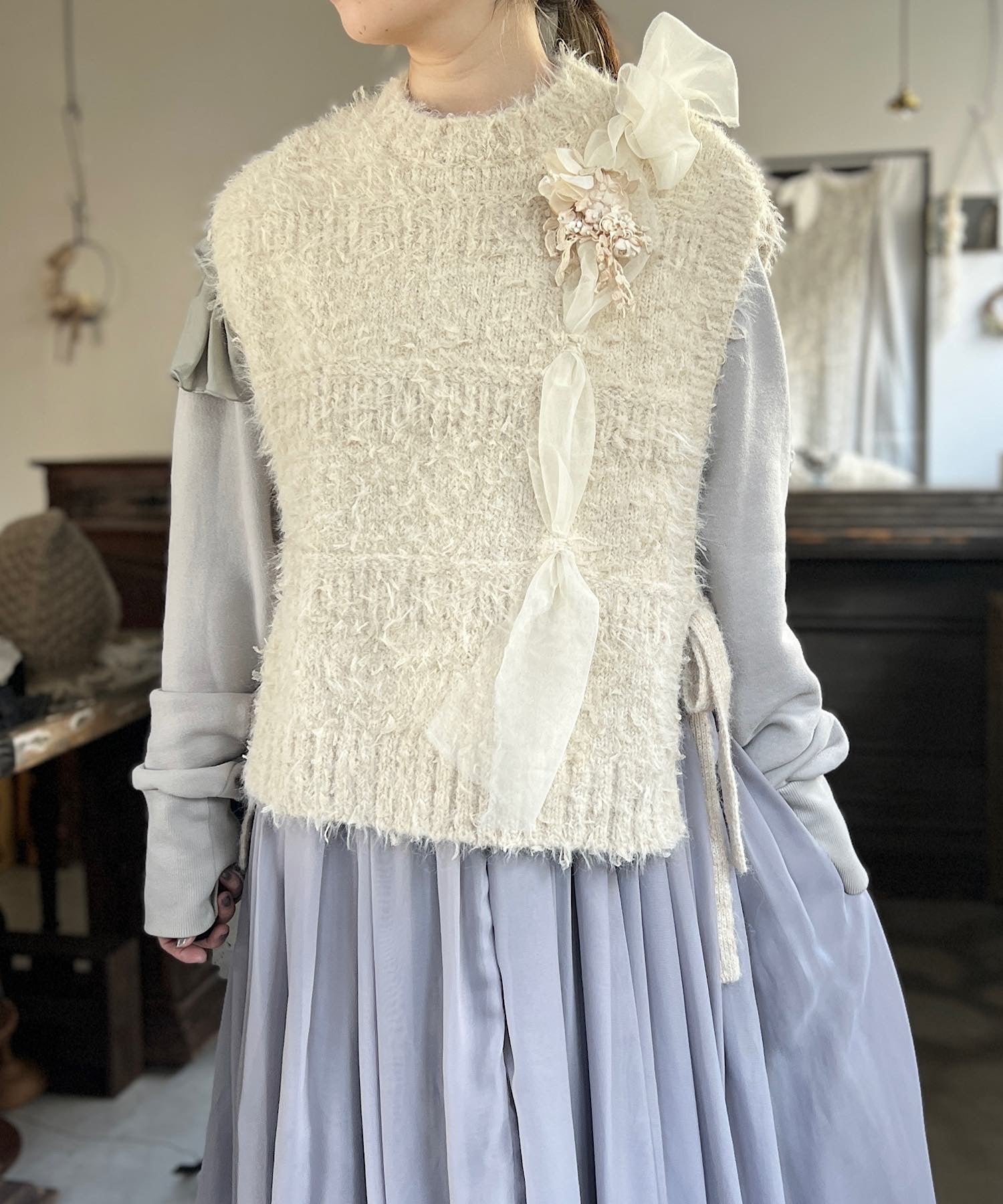 お花モチーフとリボンヤーンのニットベスト