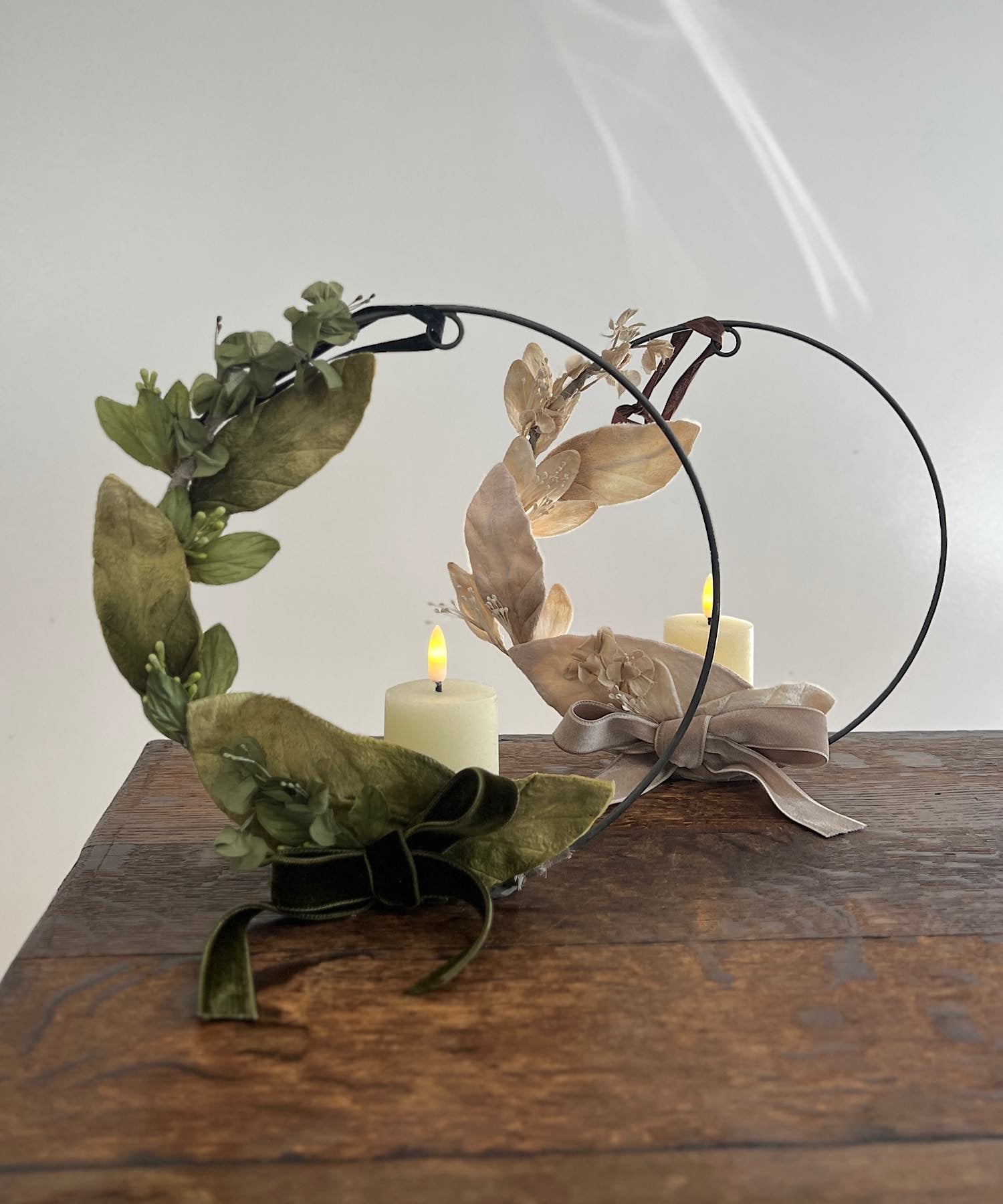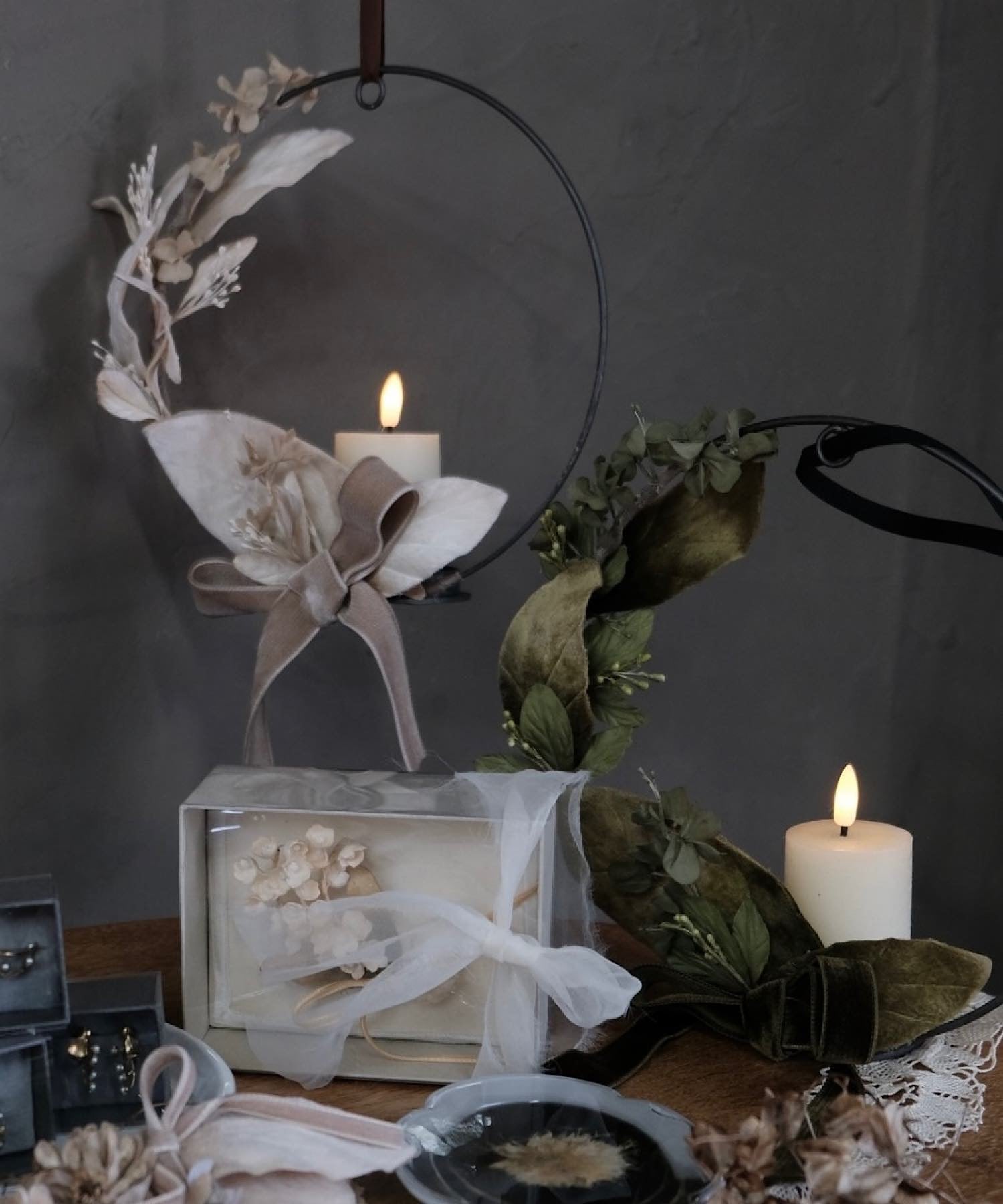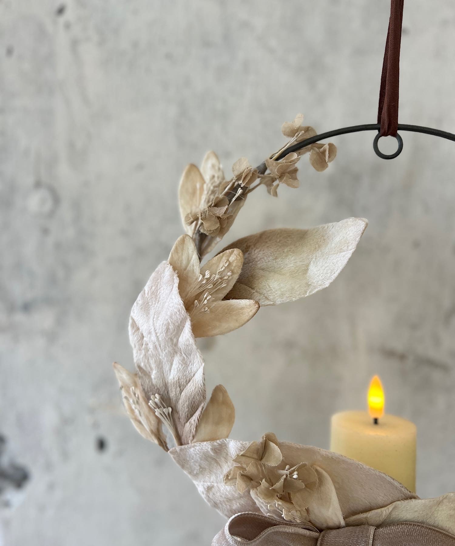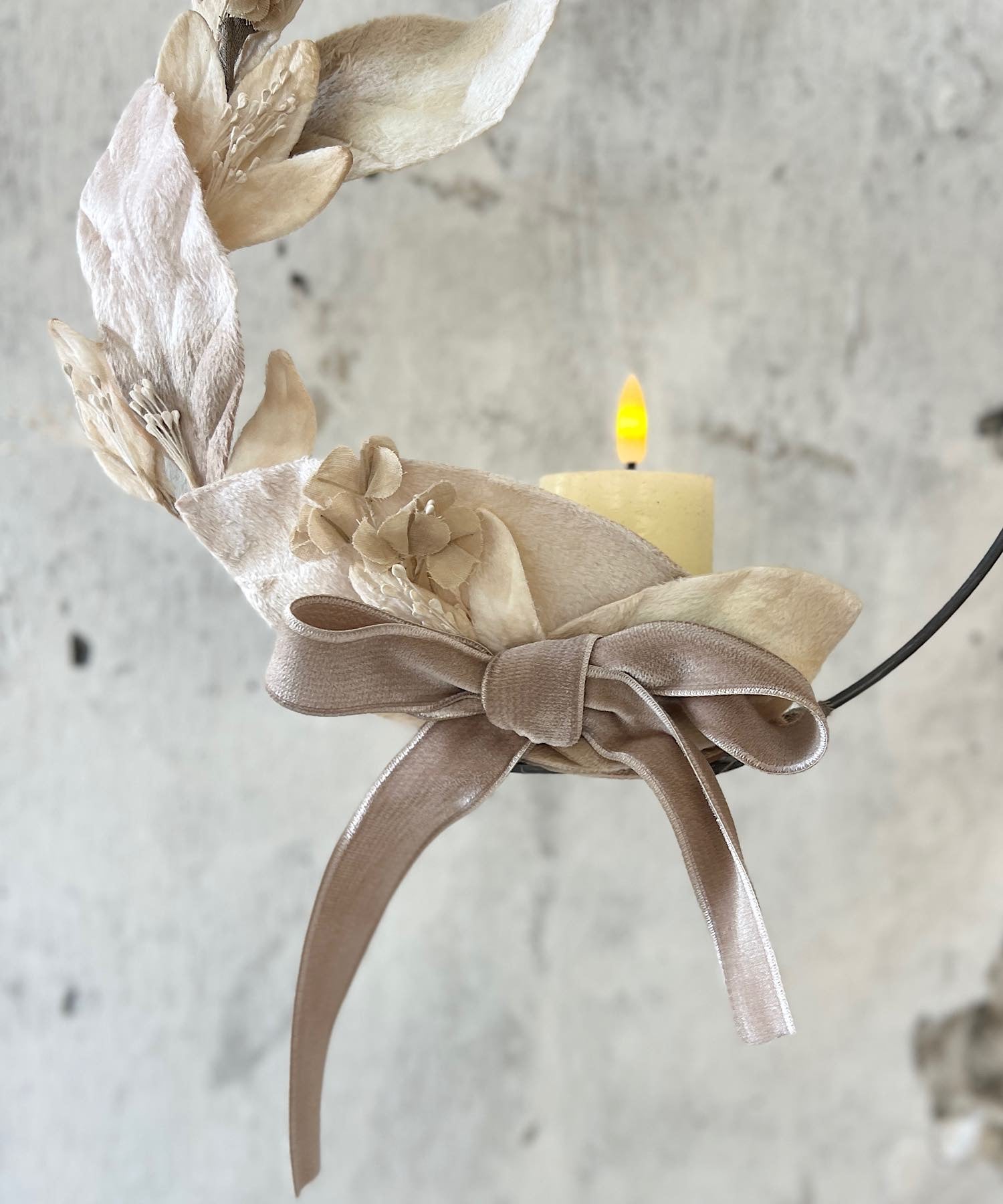 無骨なアイアンリースに、オリジナルの布花のあしらいました。