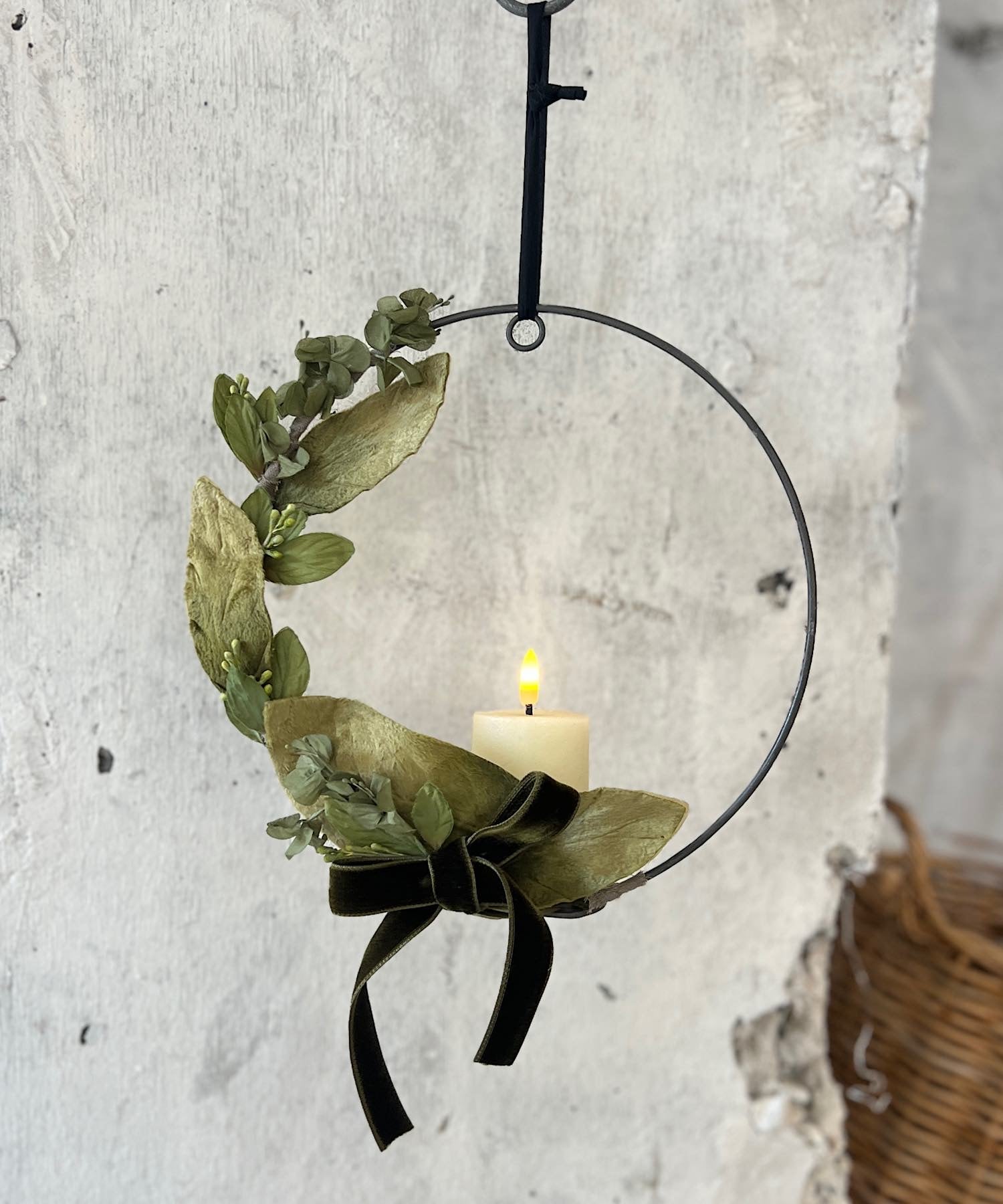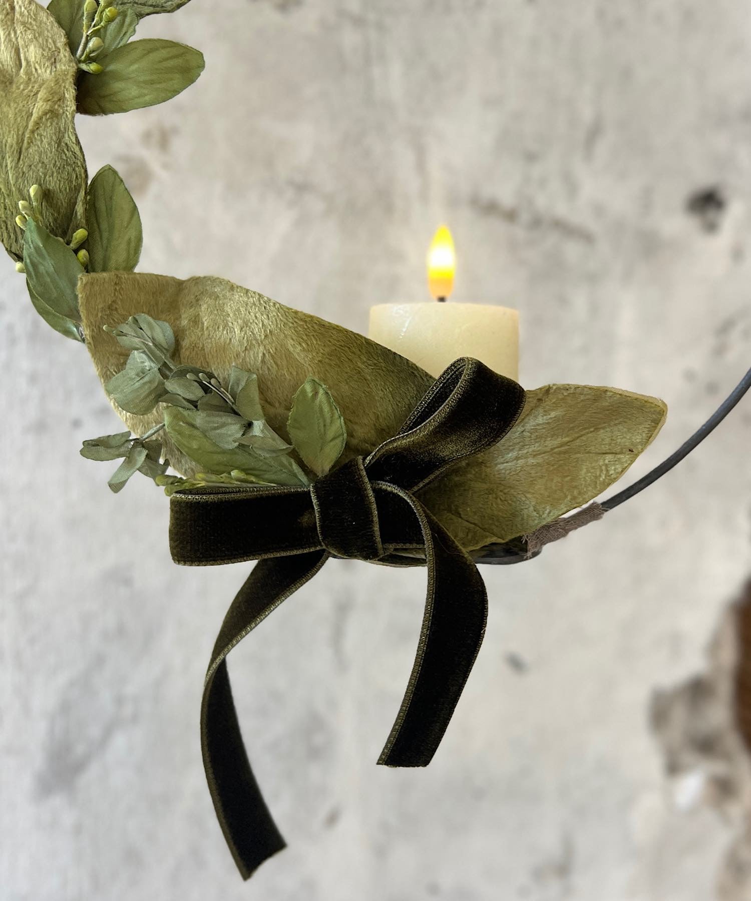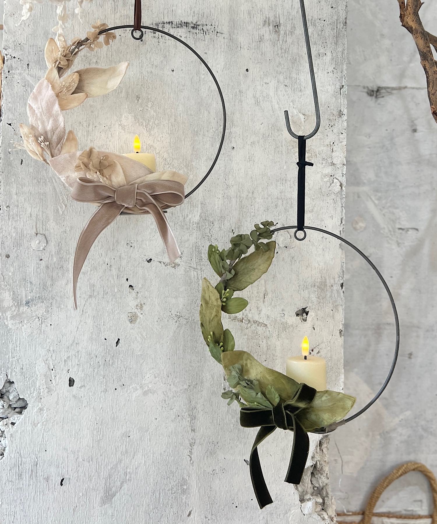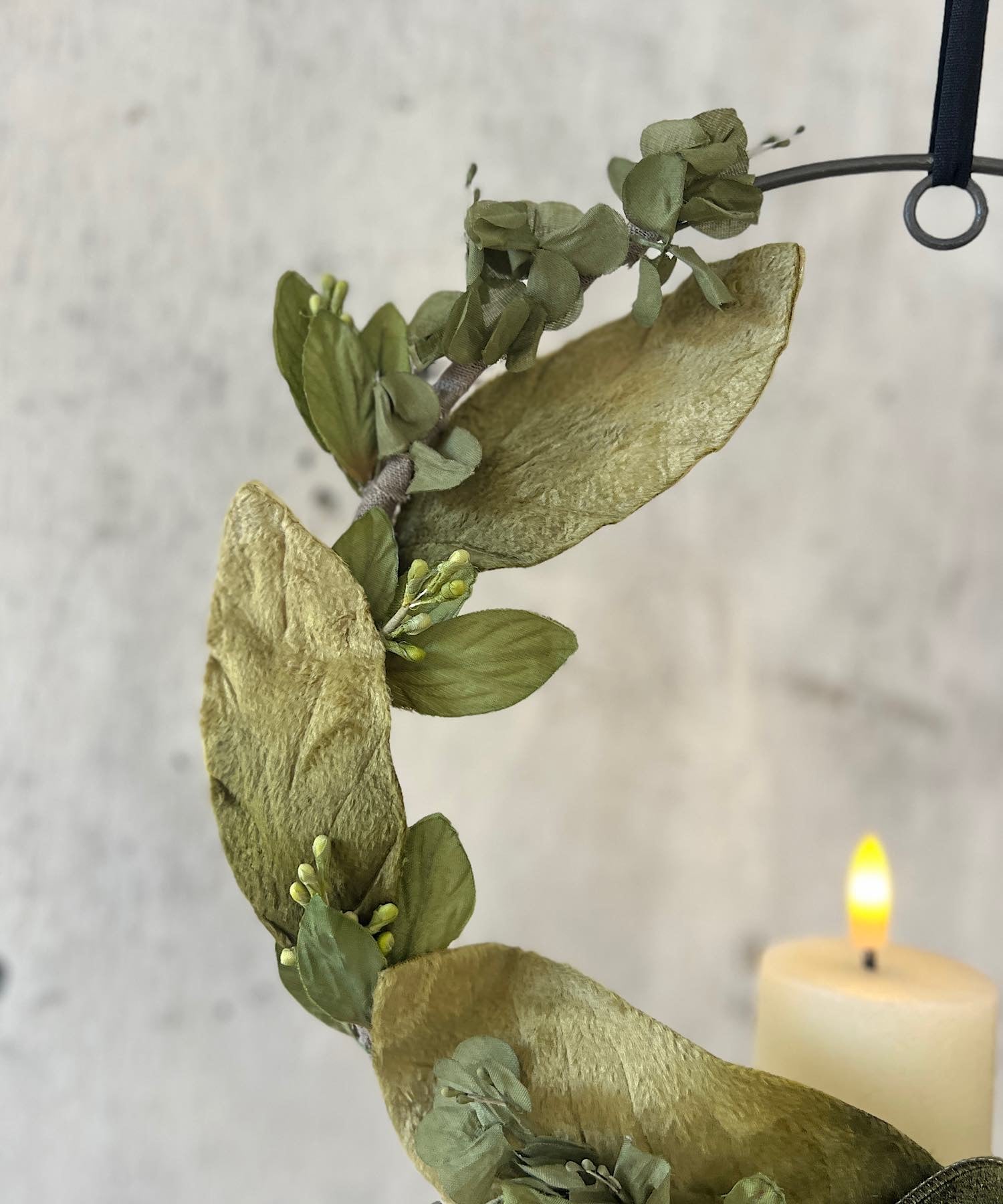 無骨なアイアンリースに、オリジナルの布花のあしらいました。