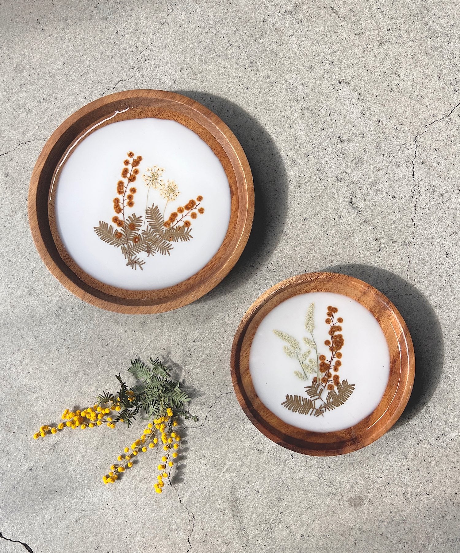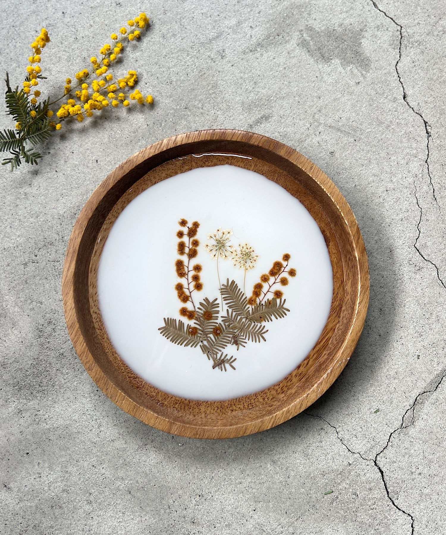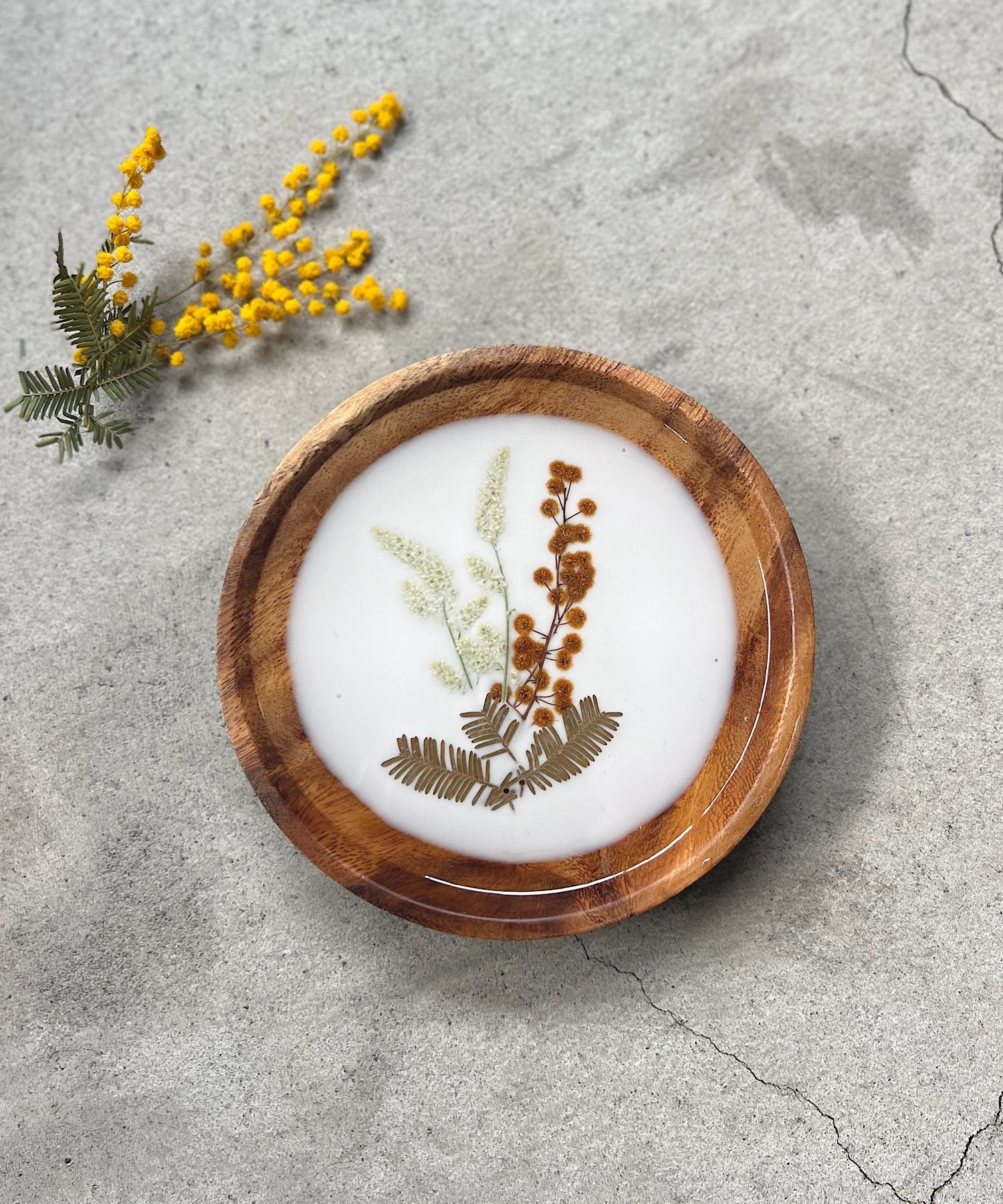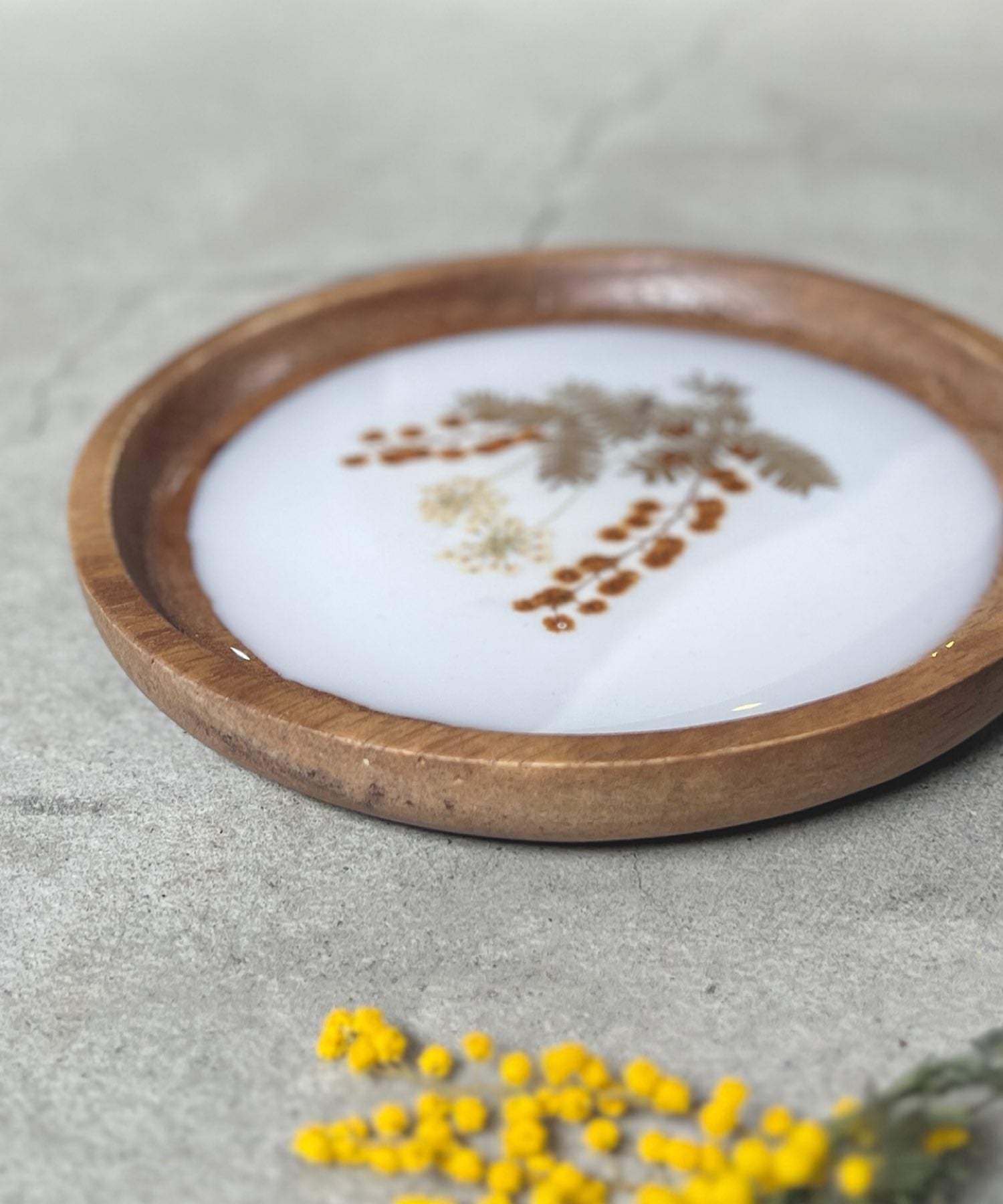 ミモザの押し花をそっと閉じ込めたプレート。