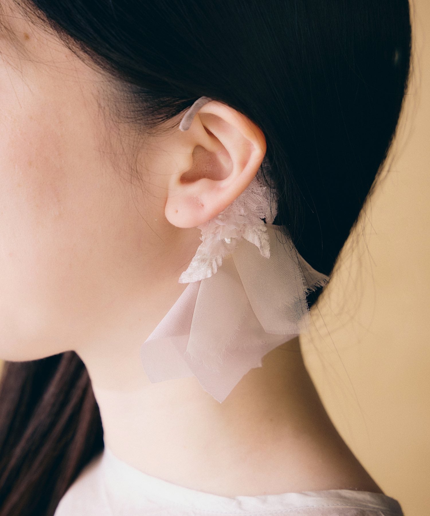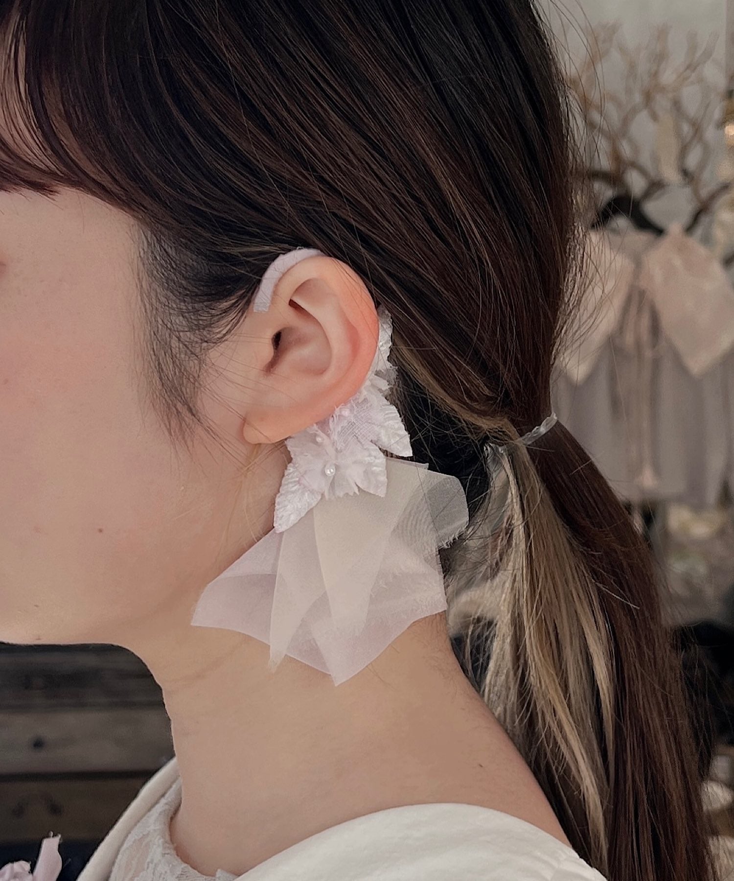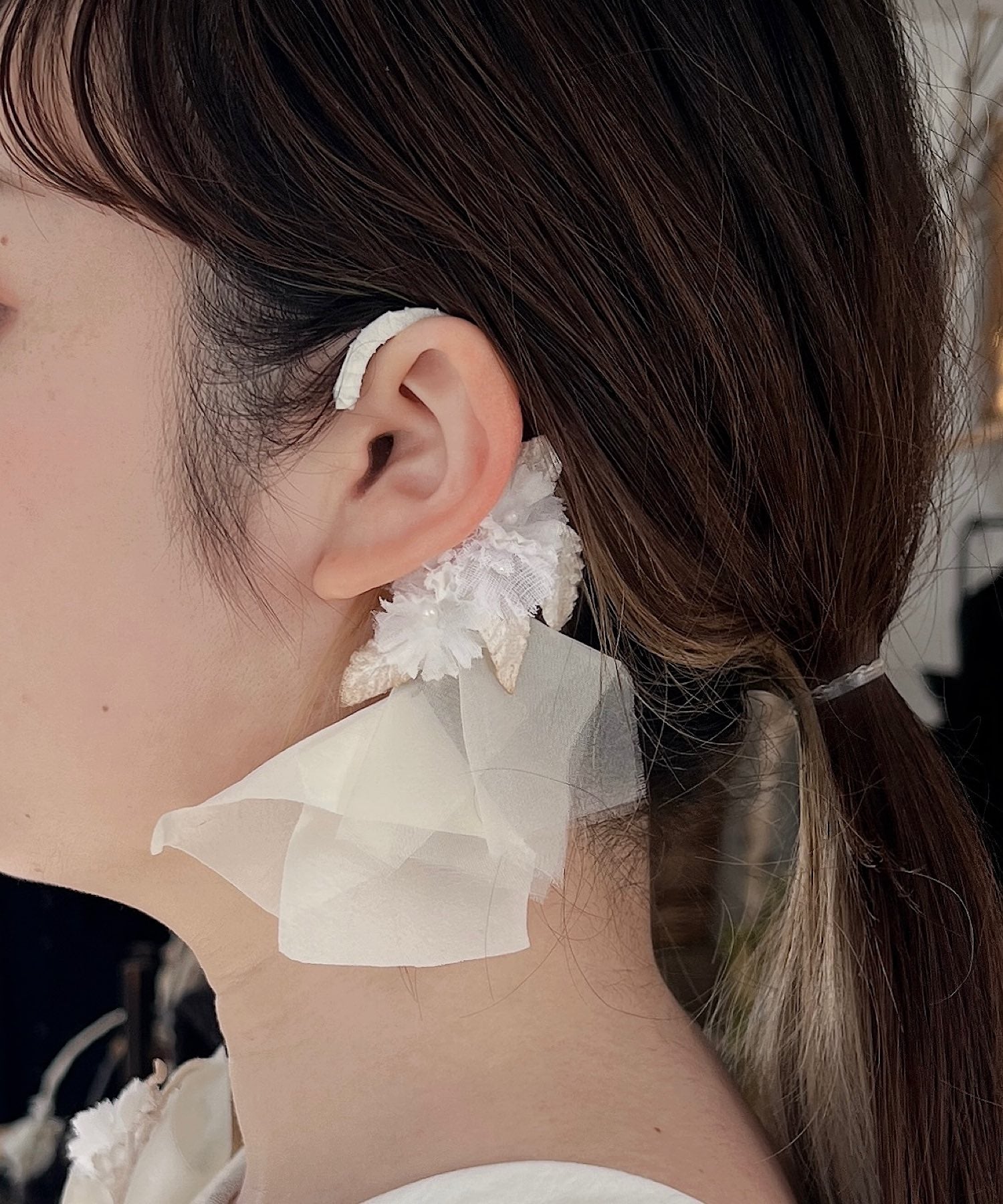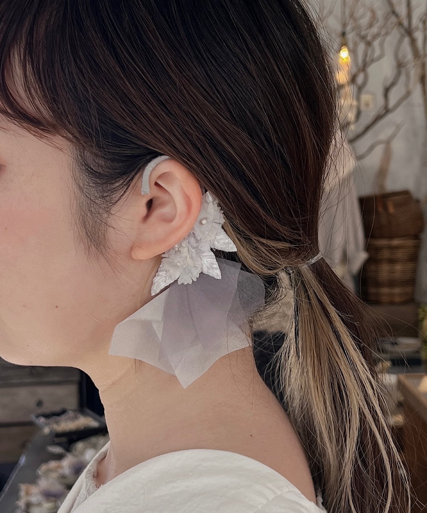 サテン生地にさりげなくお花を添えた、片耳用のイヤーフック。